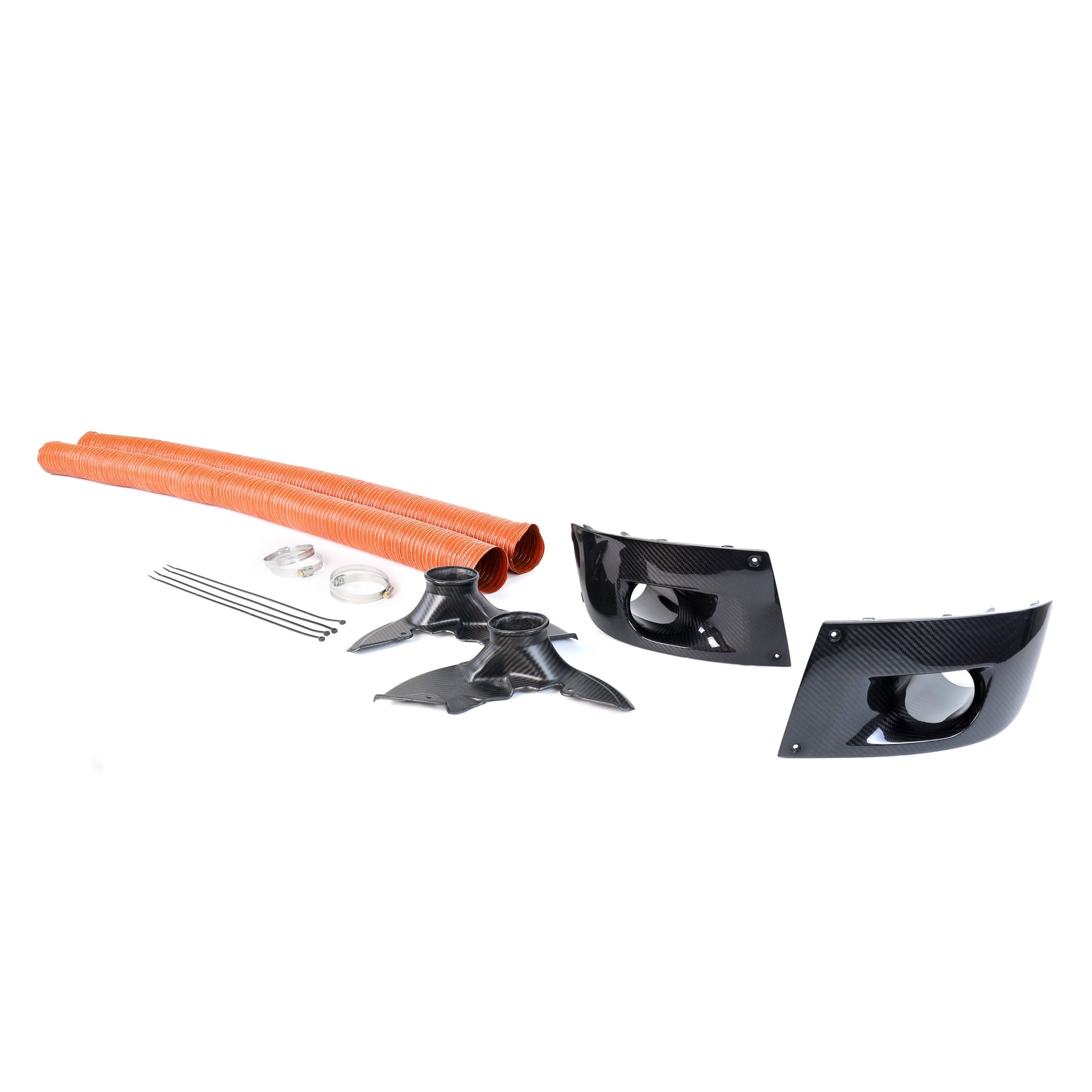 The APR Brake Cooling Ducts are aerodynamically-optimized to "funnel in" massive amounts of air. Also known as the venturi effect, when the vehicle speed increases, this funneled-in air increases in both pressure and velocity as it passes from the larger frontal area into the smaller pipe section of the brake duct. When matched with appropriate high-temperature air duct hoses, the APR Brake Cooling Ducts will help to channel in large volumes of fresh air to help cool down red-hot brake rotors lap after lap on the track.