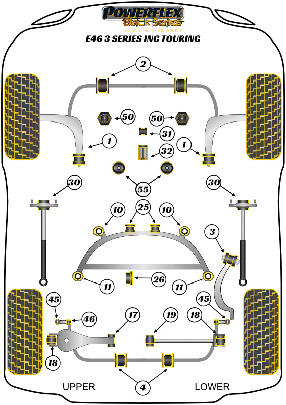 PFF5 offers additional +0.33of caster over PFF5 and is a high performance option to PFF5 and aimed at offering greater precision for people wanting the very best from their E46 or Z4 Testing during the development of this bush has indicated stiffness gains of 190% compared with the original rubber bush. This new part, fitted to the rear of the front wishbone has a hard anodised aluminium outer shell with one of our unique low friction polyurethane centre bushes. The poly/alu combination creates a low friction rotating bush reducing the forces acting on the arm. Lower arm deflection has been decreased by reducing the compliant material within the aluminium shell. Results are less movement in the arm under cornering and braking, improving steering control and feel. PFF5 is for the earlier models with 60mm bore mounting bracket. Please ensure you have the correct size bush before fitting.