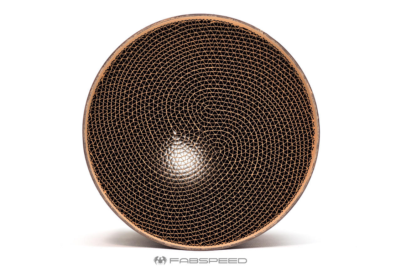 - Fabspeed-proprietary 200-cell HJS high-flowing catalytic converters using T304L stainless steel