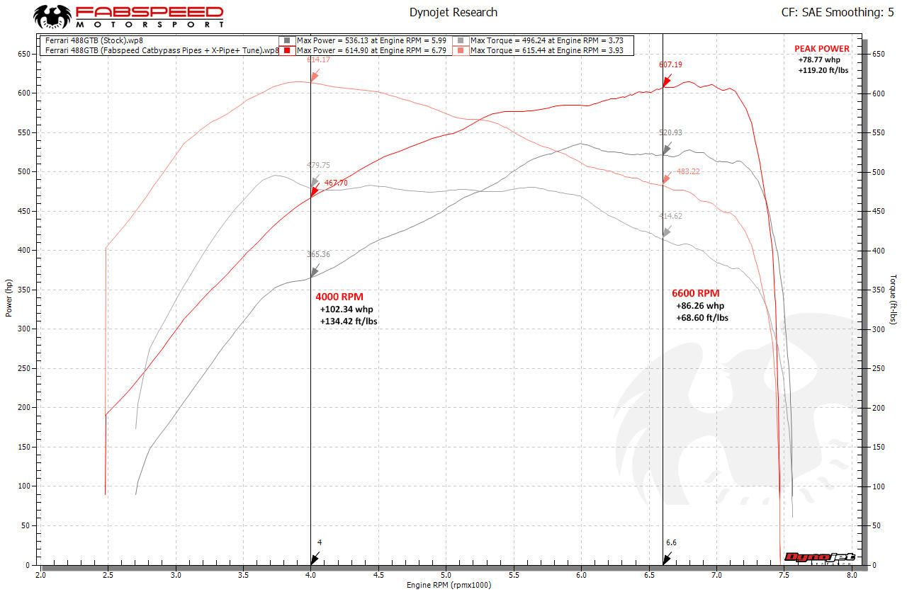As tested on our Dynojet, our Catbypass Pipes in conjunction with our X-Pipe and ECU Tune add 102 whp and 134 ft/lbs of torque at 4000 RPM. Further up the rev range, this setup gives you major grunt as well: 86 whp and 69 ft/lbs of torque at 6600 RPM. Peak power is up by 78 whp and 119 ft-lbs of torque.