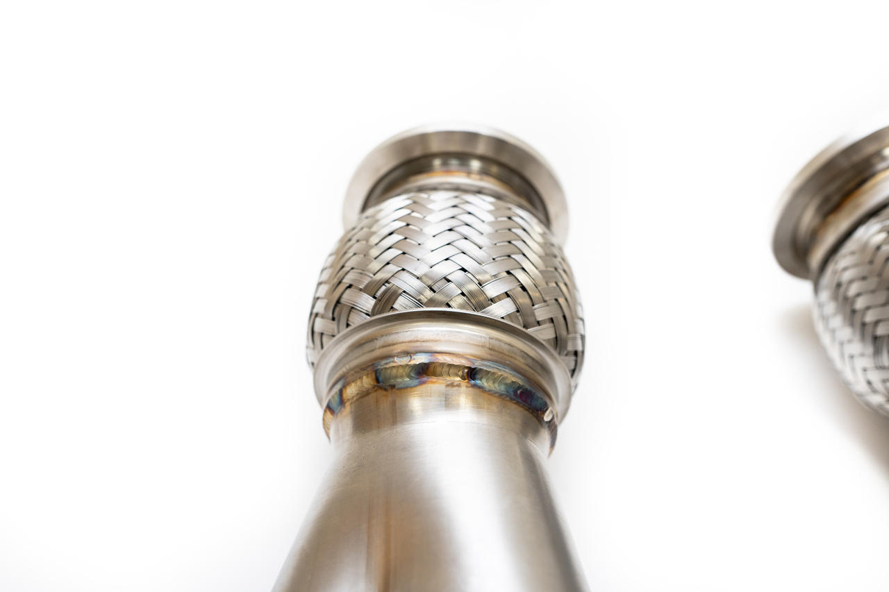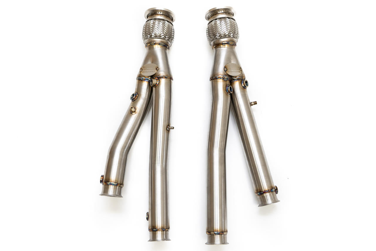 The Fabspeed Lamborghini SVJ Cat Bypass Pipes replace the factory super restrictive 600 CPSI catalytic converters resulting in improved exhaust flow and giving the car a much better exhaust note. These Cat Bypass pipes are recommended along with a ECU Tune to maximize efficiency and have the car operate correctly with reduced back pressure.