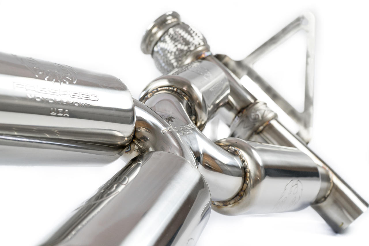 VALVES CLOSED: Exhaust flow is channeled through Fabspeed's signature 63.5mm 2.5" Quad-Resonated X-pipe. We engineered it specifically to smooth out exhaust pulses for a sophisticated and exotic ripping exhaust note while being as free flowing as possible with a noticeable improvement in performance over OEM. The tone is perfect for cruising around town or long highway drives.
