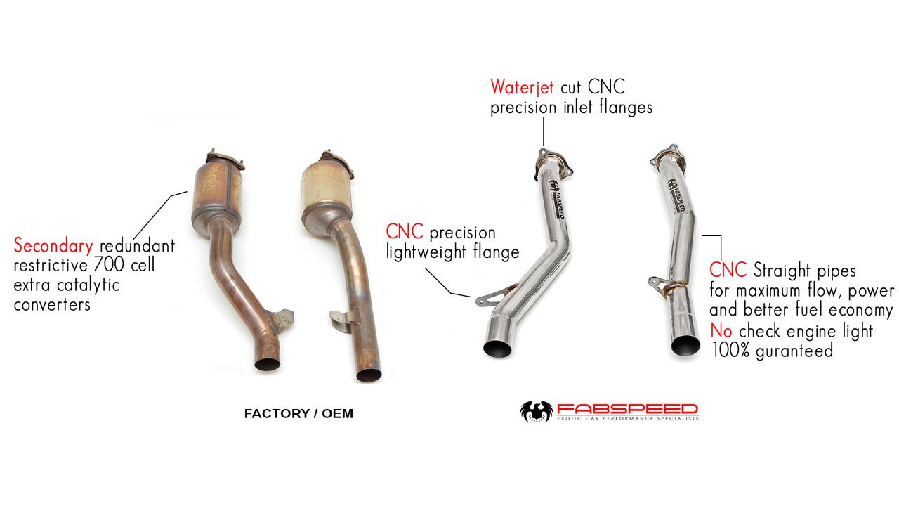 Fabspeed's Secondary Catbypass Pipes replace the restrictive factory catalytic converters with much less restrictive straight-through pipes for maximum flow and performance.