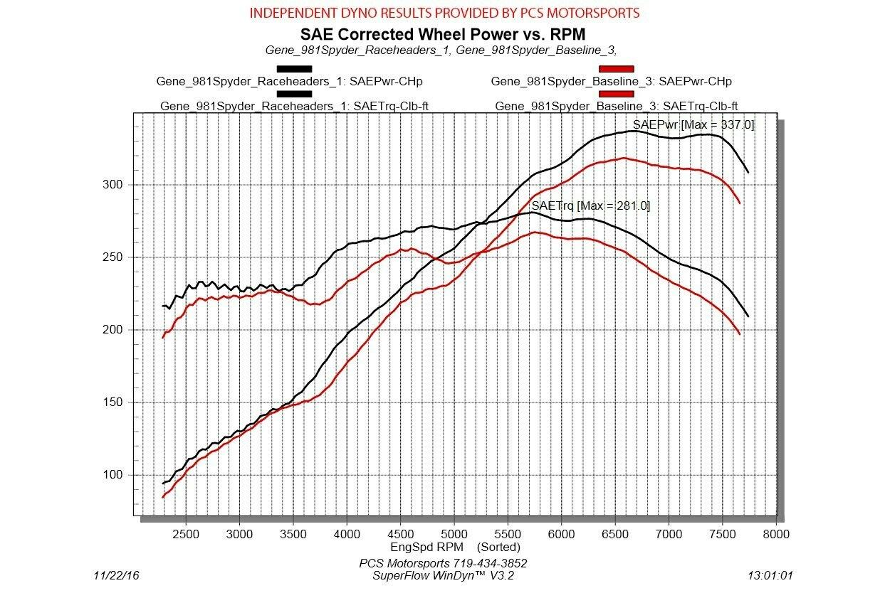 Fabspeed's Race Headers for the Porsche Cayman GT4 are built to optimize the engine's exhaust flow for maximum performance. Our precision-engineered headers add up to 18 horsepower at the wheels and 15 ft/lbs of torque at 6300 RPM, increasing the already impressive performance of the Porsche GT4. Down low these Race Headers give you a kick in the pants, adding 27 whp and 38 ft/lbs of torque at 3700 RPM.