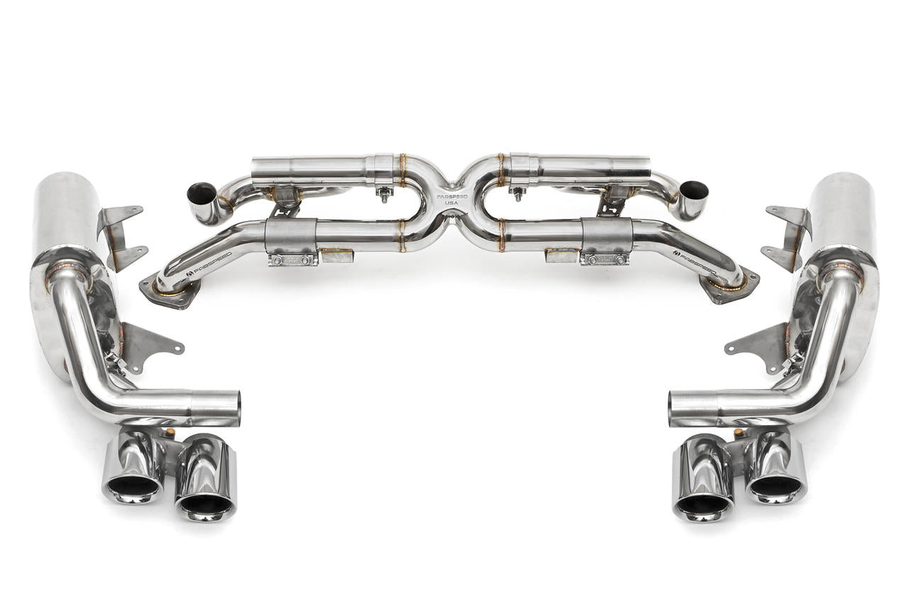 Fabspeed's Valvetronic Exhaust System replaces the restrictive OEM side mufflers and center muffler for a deeper, throatier exhaust note along with improved power and throttle response. With valves open, unleash a bold roar from your 991.