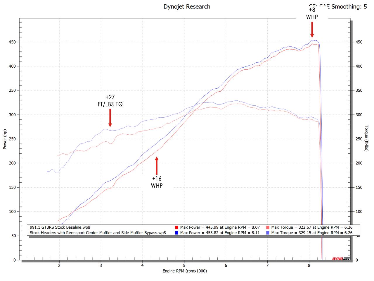 On our 997.1/ 997.2 GT3 and GT3RS test car, paired with our Side Muffler Muffler Bypass Pipes, the Rennsport Muffler picked up an impressive 27 ft/lbs of TQ down low at 3,200 RPM. From 2,900 RPM all the way to 5,700 RPM it picks up =12 horsepower or more, and peak power at the wheels is up from 446 to 454! That’s a gain of over 12 HP at the crank- from simply swapping out the fragile restrictive OEM Porsche 997GT3 to the very latest GT3 RS Titanium OEM factory mufflers. BEST ADVICE- but and install a Fabspeed GT3 center muffler and SAVE you fragile OEM GT3 muffler for Concours shows and restoration. All GT3 OEM mufflers BREAK & EXPLODE when driven long and hard enough.