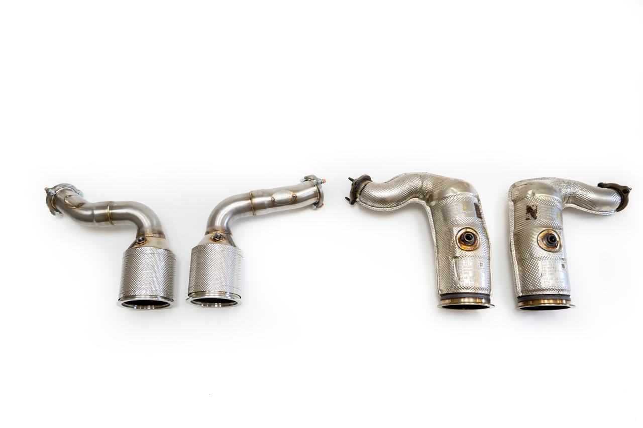 Direct replacement/upgrade for the stock OEM ceramic restrictive catalytic converters, bolt-on Ultra High Flow HJS catalytic converters.