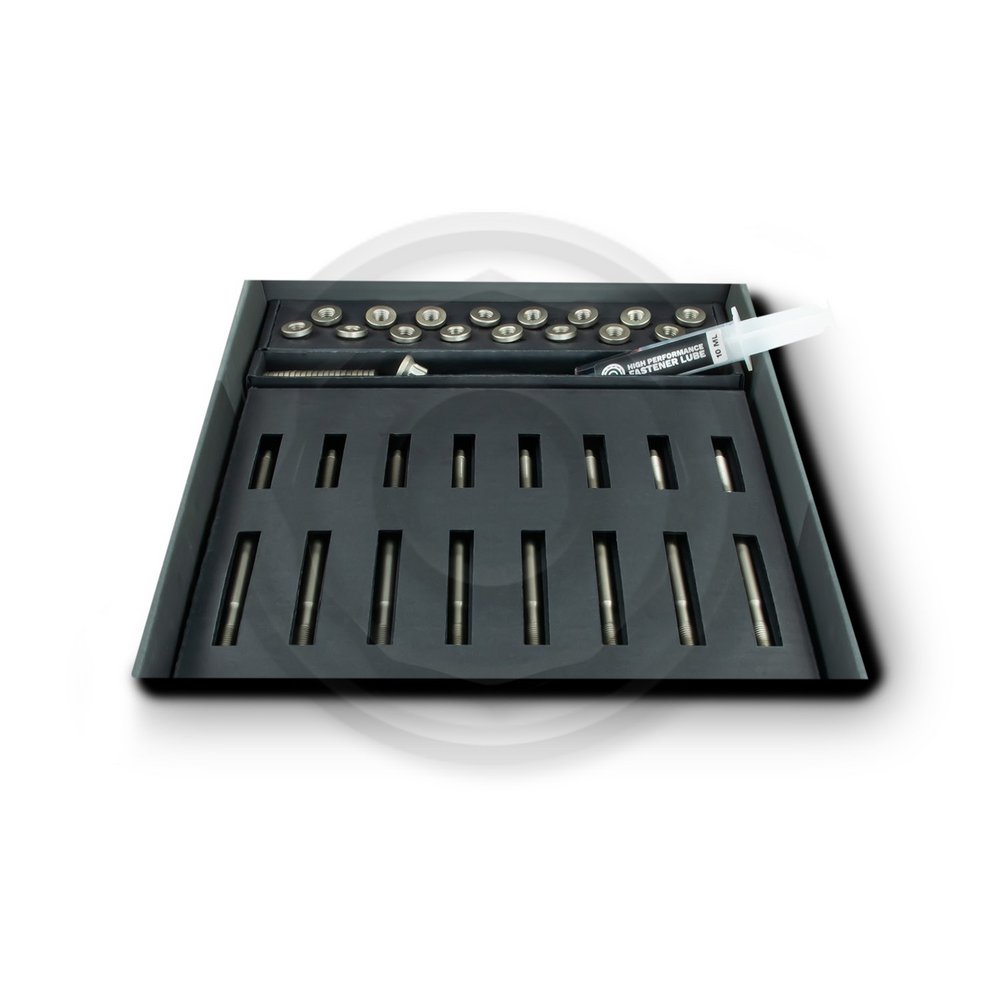 This set replaces the original cylinder head bolts with high-strength Pro-Series 18.8 stud bolts. This is necessary in the case of significant Performance increases, as the original cylinder head bolts can elongate during operation and the cylinder head can lift off. The Pro-Series 18.8 stud bolts with a tensile strength of 1850 N/mmý provide a remedy For this. In addition, these stud bolts do not need to be replaced after disassembly, but can be reused.